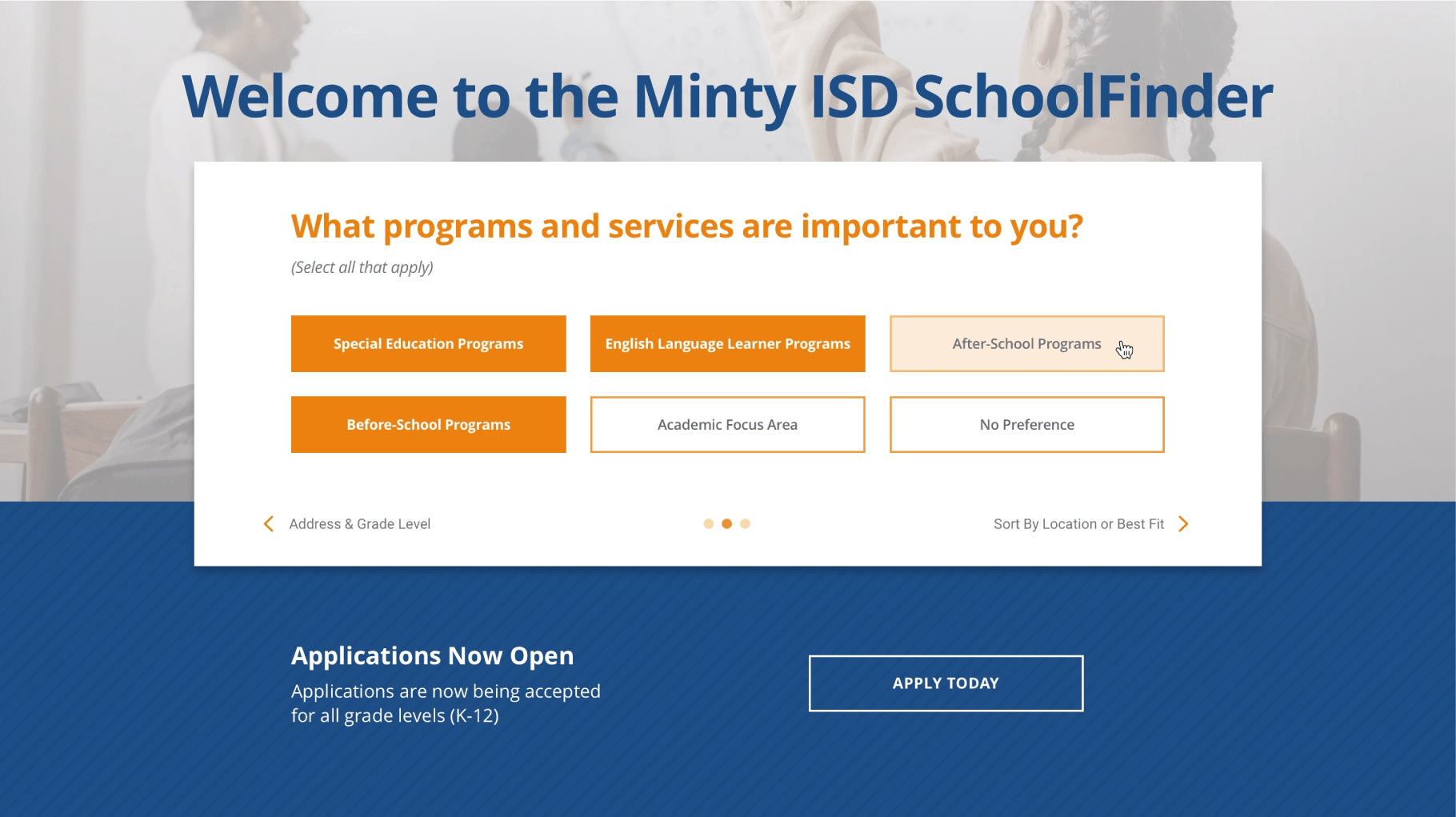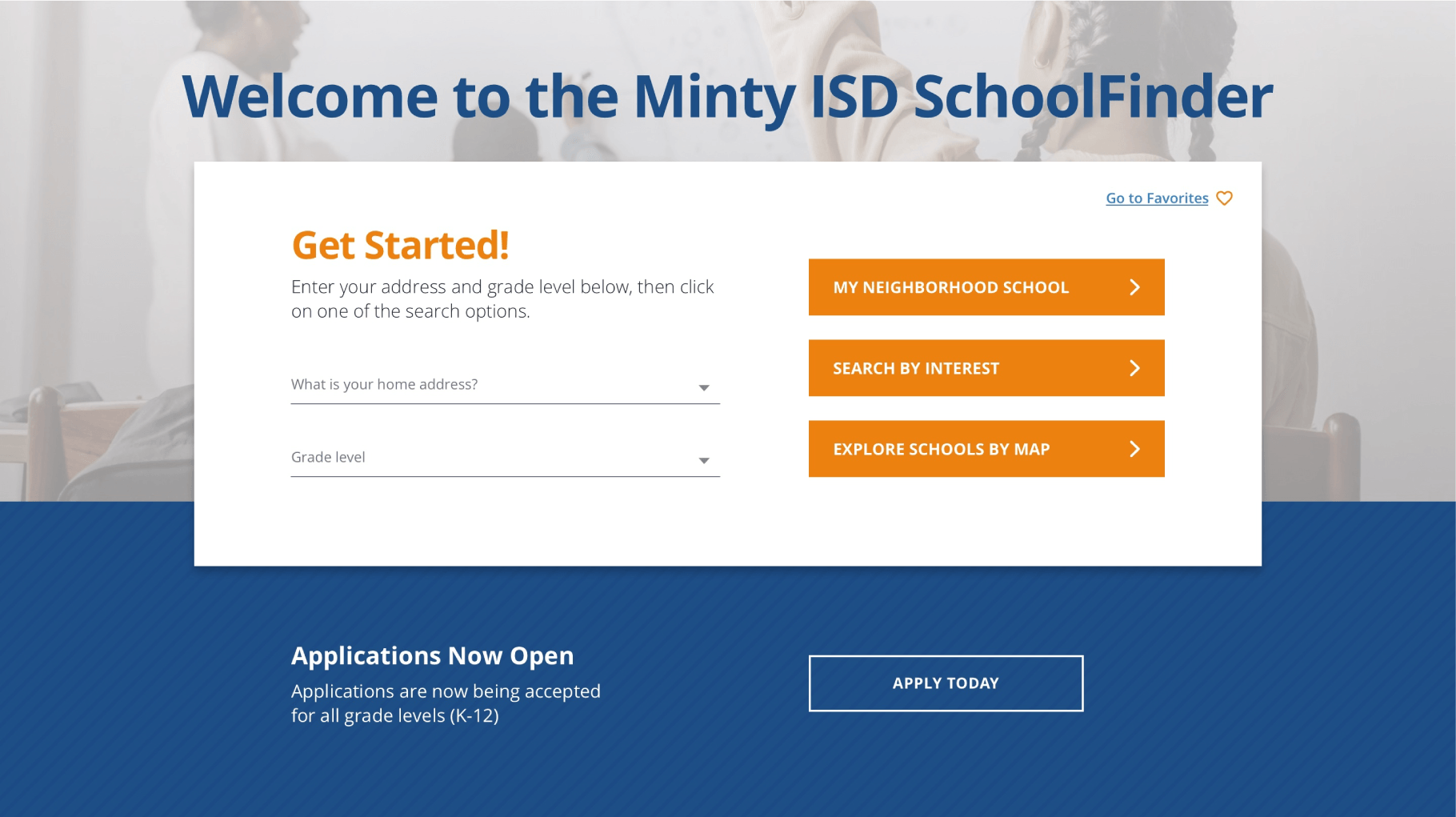 Minty ISD has a lot to offer families and students! Over the past 86 years, Minty ISD has worked to expand choice so every family can find a school that satisfies their needs, interests and priorities. Our easy to use School Finder search tool can help you find the right school for you and your family.